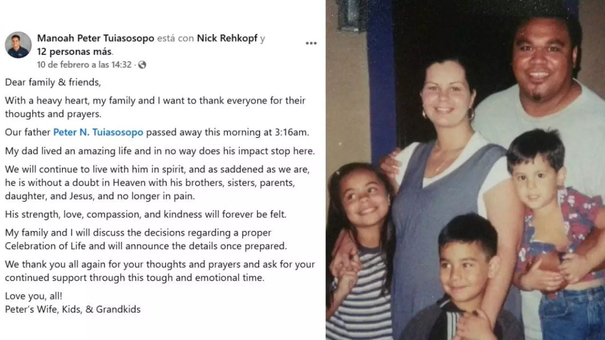 La noticia fue confirmada por su hijo Manoah Peter Tuiasosopo, quien reveló que la muerte ocurrió en la madrugada del 10 de febrero en Phoenix, Arizona. "Con gran tristeza, mi familia y yo queremos agradecer a todos por sus pensamientos y oraciones. Nuestro padre, Peter N. Tuiasosopo, falleció esta mañana a las 3:16 a. m", compartió a través de un comunicado,