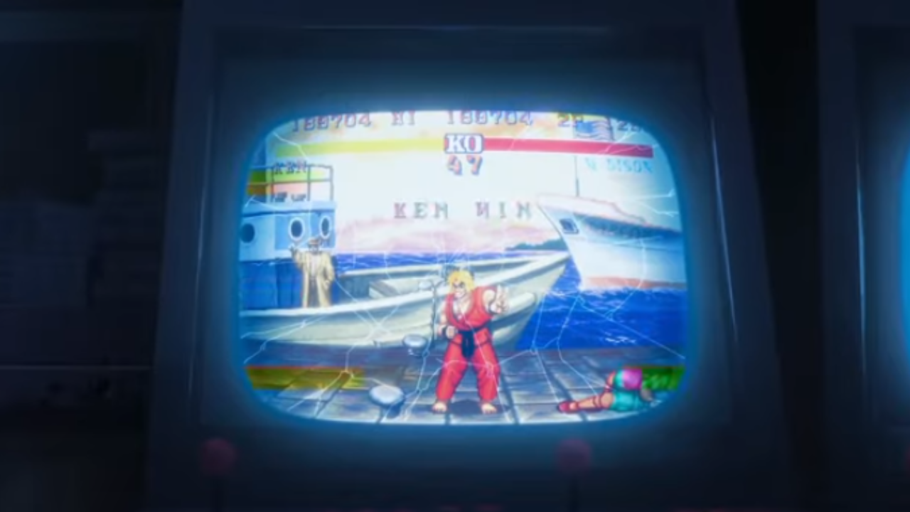 Durante la pelea, uno de los mercenarios intenta huir y pasa frente a uno de los gabinetes, justo en el momento en que Ken Masters ejecuta su icónico Shoryuken sobre M. Bison. La escena concluye con la clásica pose de victoria de Ken y el sonido de “Perfect!”, lo cual arranca una sonrisa a quienes crecieron jugando este clásico de peleas. Es un detalle breve, pero cargado de nostalgia.