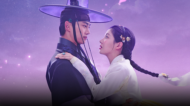 Sun-chaek y Yi-beon comparten un abrazo romántico mientras se miran directamente a los ojos bajo un hermoso cielo que atardece con colores púrpuras, escena que sin duda luce prometedora especialmente para amantes de historias de época como Mr. Queen o con dimensiones y narrativas alteradas al estilo de Extraordinary you.