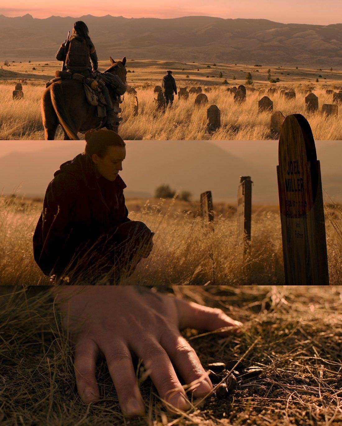 Luego del brutal asesinato de Joel a manos de Abby (Kaitlyn Dever) en el episodio anterior, la serie presentó un momento de absoluto silencio y dolor. En un claro al atardecer, Ellie se arrodilla frente a una sencilla tumba improvisada, en uno de los momentos más crudos y emocionales de toda la serie.