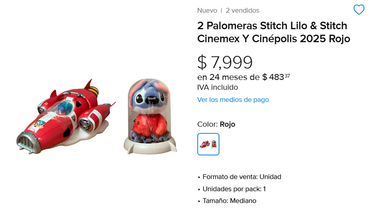 Si estás buscando la nave roja con el adorable alienígena azul al volante, el costo con el que la encontrarás ahora ronda entre los 1,900 y 3,999 pesos mexicanos. En cuanto a la cápsula con el Stitch de peluche, el precio es aún más elevado porque va desde los 2,500 hasta los 5,199 pesos.
