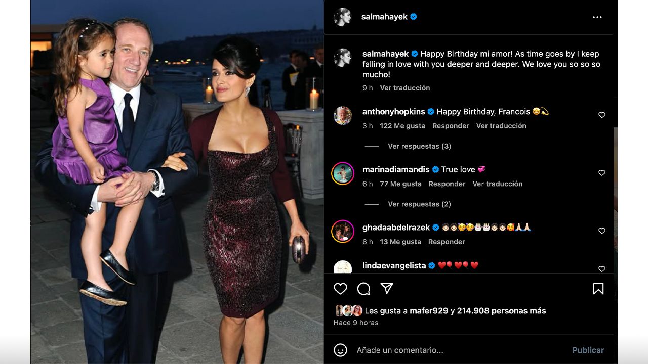 La felicitación también fue acompañada de una fotografía que data de 2011, durante un glamoroso evento ubicado en Venecia, Italia, en el que Salma, François-Henri y su hija Valentina (aproximadamente de 11 años), caminan por un muelle.