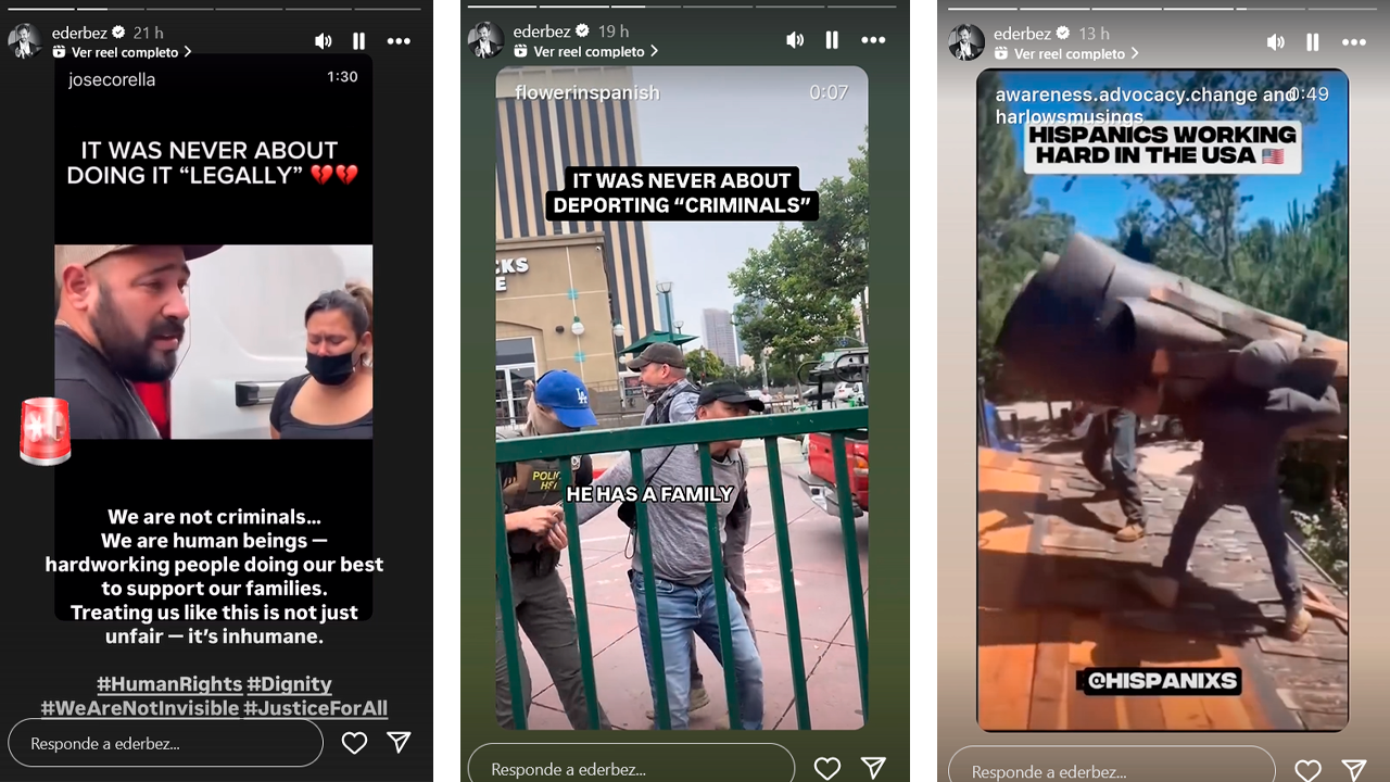 A esa publicación le siguieron cuatro videos más en los que el también actor de Y llegaron de noche puso en evidencia la forma en que estas redadas se están llevando a cabo en Estados Unidos. Familias llorando al ser distanciadas, oficiales esposando personas mientras caminan por las calles y un video respecto al trabajo que realizan los inmigrantes en el país del norte se observan en la red social del mexicano.