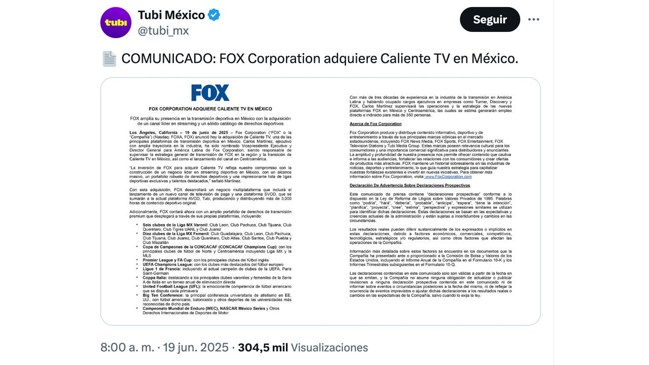 Como parte del comunicado oficial compartido a través de X, Tubi México reveló que Caliente TV ahora forma parte de Fox Corporation y que además de lanzar un canal de televisión de paga, fortalecerán la plataforma de streaming gratuita al producir y distribuir más de 3,000 horas de contenido deportivo original. Entre los derechos de transmisión a los que la plataforma tendrá acceso, son los de la Liga MX, Liga MX Femenil, CONCACAF Champions Cup, Premier League, Coppa Italia, Ligue 1, FA Cup y la UEFA Champions League.