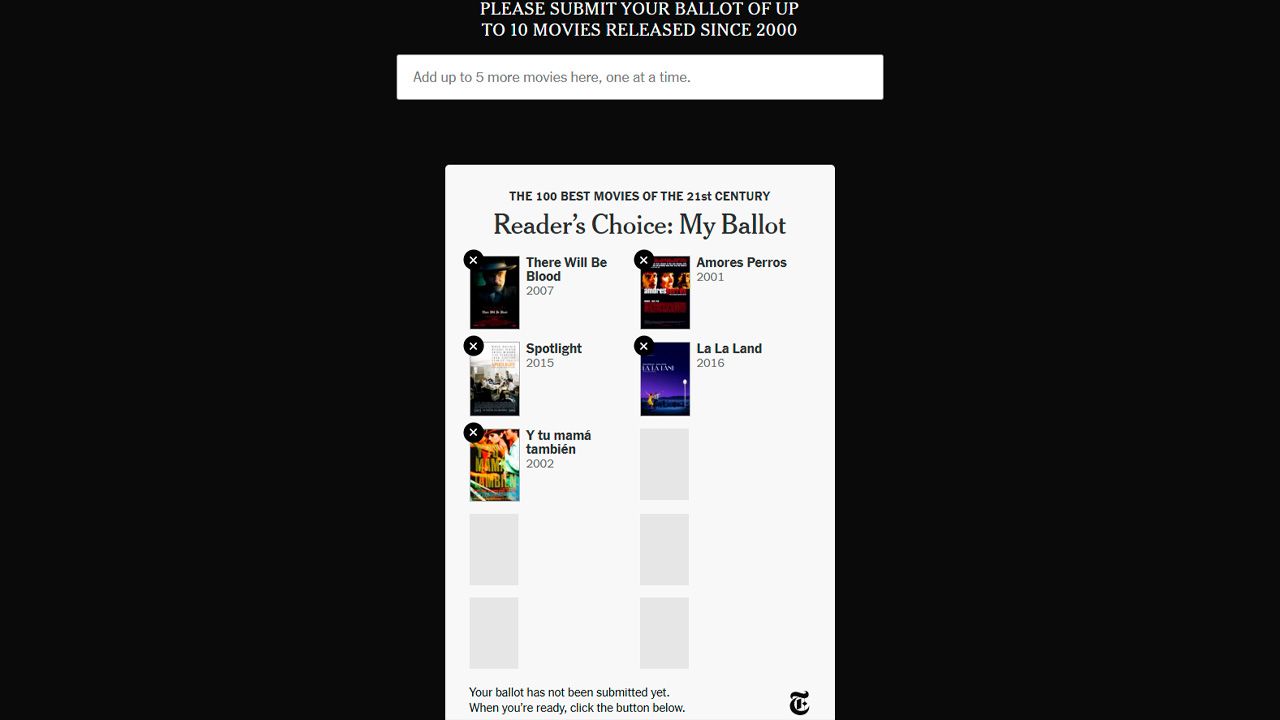 Al ingresar al sitio aparece la leyenda “Las 100 mejores películas del siglo XXI. Emite tu voto”, acompañado de un botón para compartir el artículo. Al navegar por la página, se lee “Más de 500 directores, actores y otros notables fanáticos del cine, incluyendo Julianne Moore y Pedro Almodóvar, Mel Brooks y Barry Jenkins, enviaron sus boletas sobre las Mejores Películas del Siglo XXI. Ahora es tu turno de votar”.