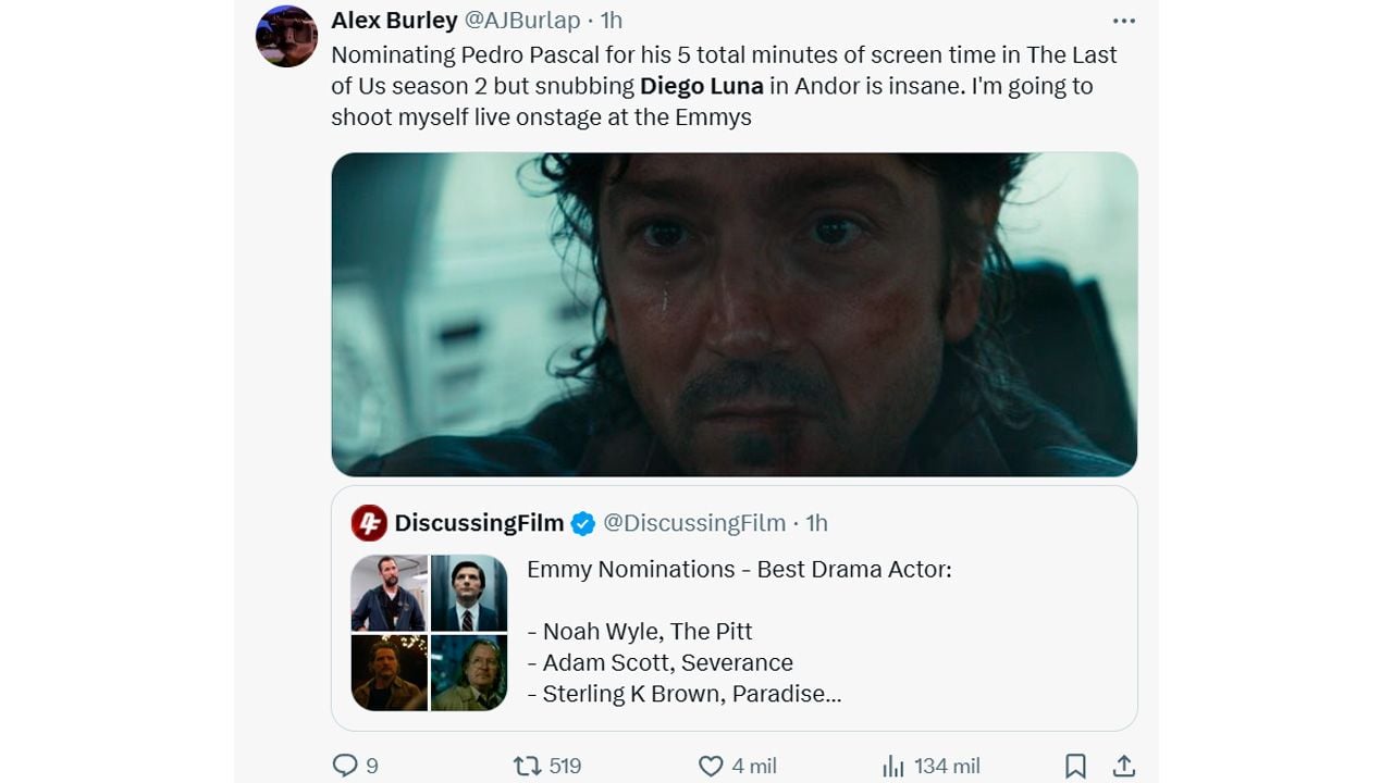 En X, usuarios como @AJBurlap escribieron “Nominar a Pedro Pascal por sus cinco minutos en total en pantalla en The Last of Us, pero omitir a Diego Luna en Andor es una locura. Me voy a matar en vivo en el escenario de los Emmys”, “Estuvo en dos episodios. Diego Luna lo merecía más”, “Es un disparate que Pedro Pascal tenga una nominación por actor principal por una temporada de televisión en la que apenas estuvo, mientras que le dan la espalda a Diego Luna por uno de los mejores trabajos de su carrera”.