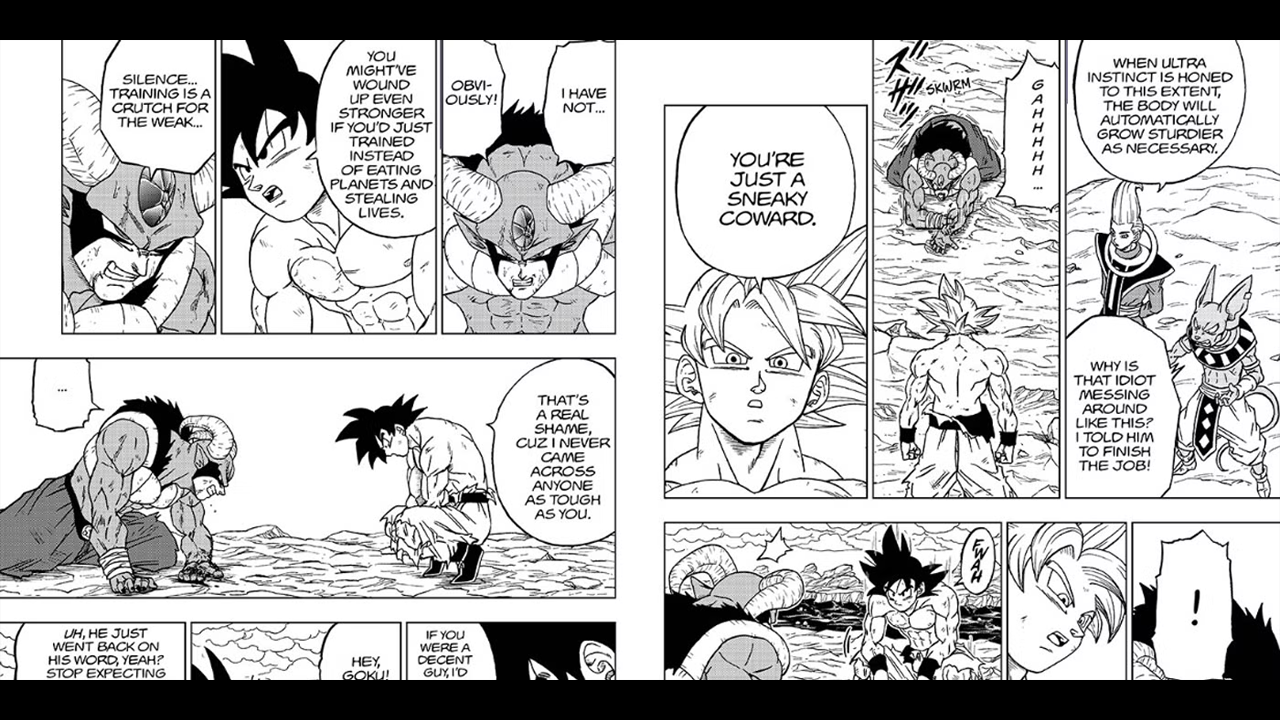 El elogio de Goku tiene lugar en el capítulo 65 de Dragon Ball Super, donde Kakarotto casi derrota a Moro. Con él en el suelo, prácticamente a los pies del Saiyajin, este le pregunta si alguna vez ha entrenado. Moro se ofende ante la sugerencia, pero Goku le dice que podría haberse vuelto mucho más poderoso simplemente entrenando, en lugar de vagar por el universo devorando planetas. Es entonces cuando Goku sorprende a todos al decir: "Es una verdadera lástima, porque nunca me encontré con alguien tan fuerte como tú".