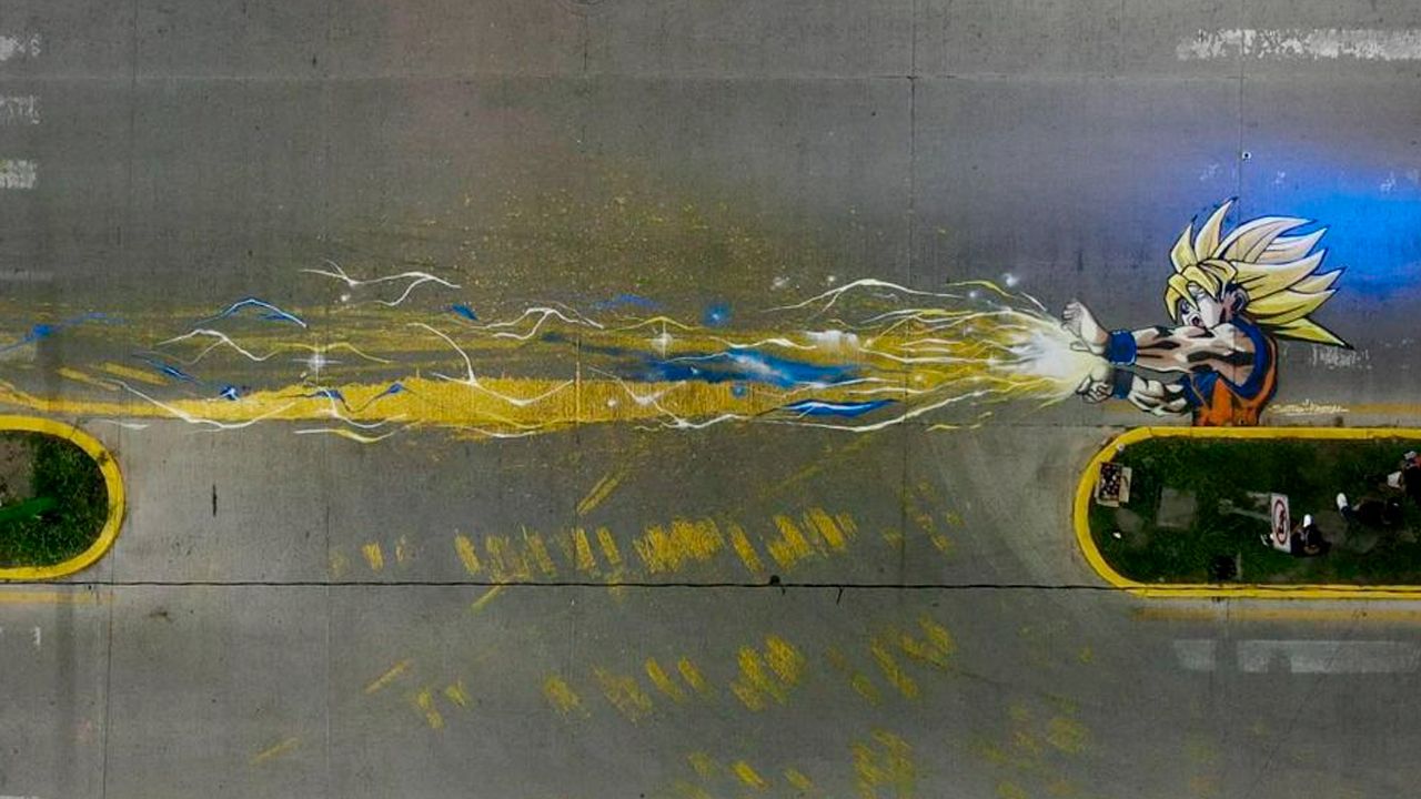 Los artistas urbanos, que firmaron la imagen con el nombre Soto Fresh, pintaron a Kakarotto en un extremo de la mancha amarilla. El protagonista de Dragon Ball Z porta su emblemático gi naranja y transformado en super saiyajin arroja su poder más especial.