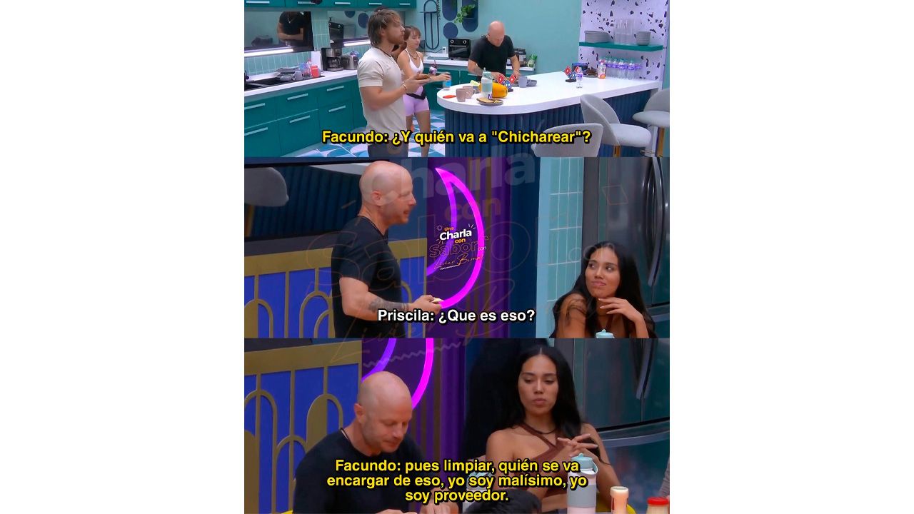 Mientras los espectadores veían cómo algunos de los habitantes comían en la cocina, el conductor comentó “¿Y quién va a ‘Chicharear?’”, a lo que Priscila Valverde preguntó a qué se refería. Fue entonces cuando Facundo respondió “Pues a limpiar, quién se va a encargar de eso. Yo soy malísimo, yo soy proveedor”. Aunque su declaración hacía referencia al video viral del Chicharito Hernández, algunos internautas no entendieron el contexto del chiste.