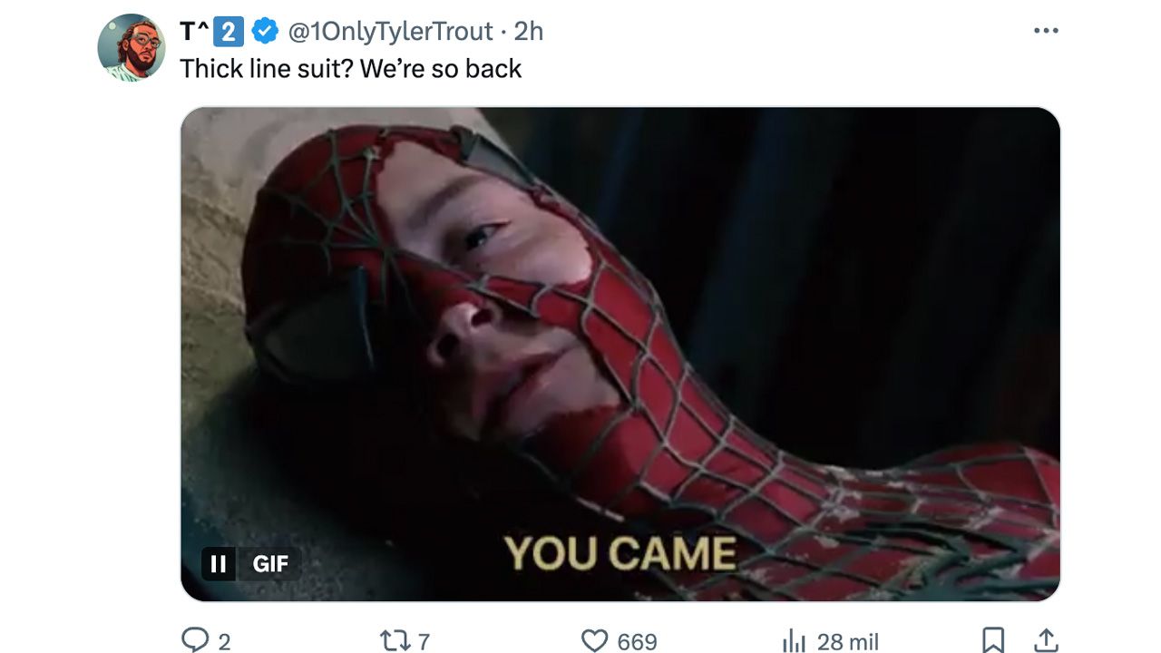 Algunos también señalaron lo diferente que es a los trajes de las entregas anteriores de Holland, pues la parte azul en ocasiones lucía brillante, mientras que el nuevo luce completamente mate… como el de la trilogía de Sam Raimi. Sin embargo, unos espectadores también comentaron que es posible que en la película use más de un traje, pues el actor británico confesó anteriormente que tendría un traje nuevo para Brand New Day.