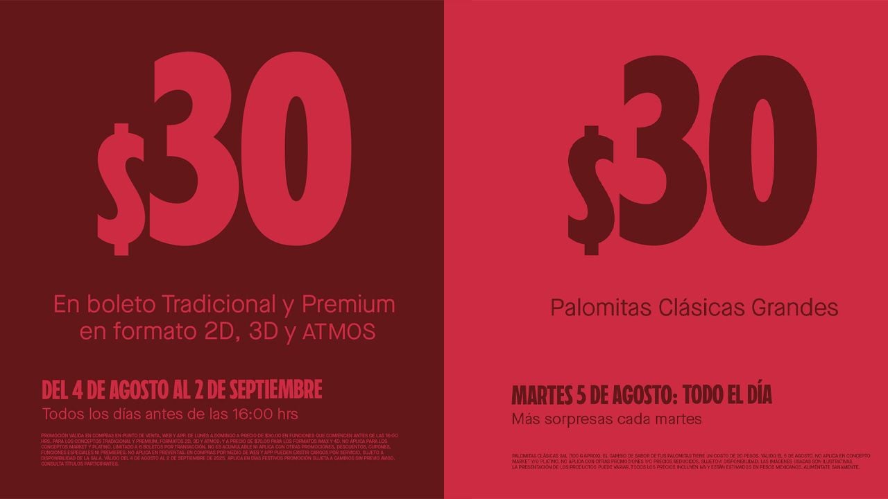 La promoción de Cinemex comienza a partir del próximo 4 de agosto y terminará hasta el 2 de septiembre, ofreciendo el precio de 30 pesos por boleto para las funciones en salas tradicionales y premium, así como para los formatos 2D, 3D y ATMOS, siempre y cuando sea antes de las 16:00 horas de lunes a domingo.