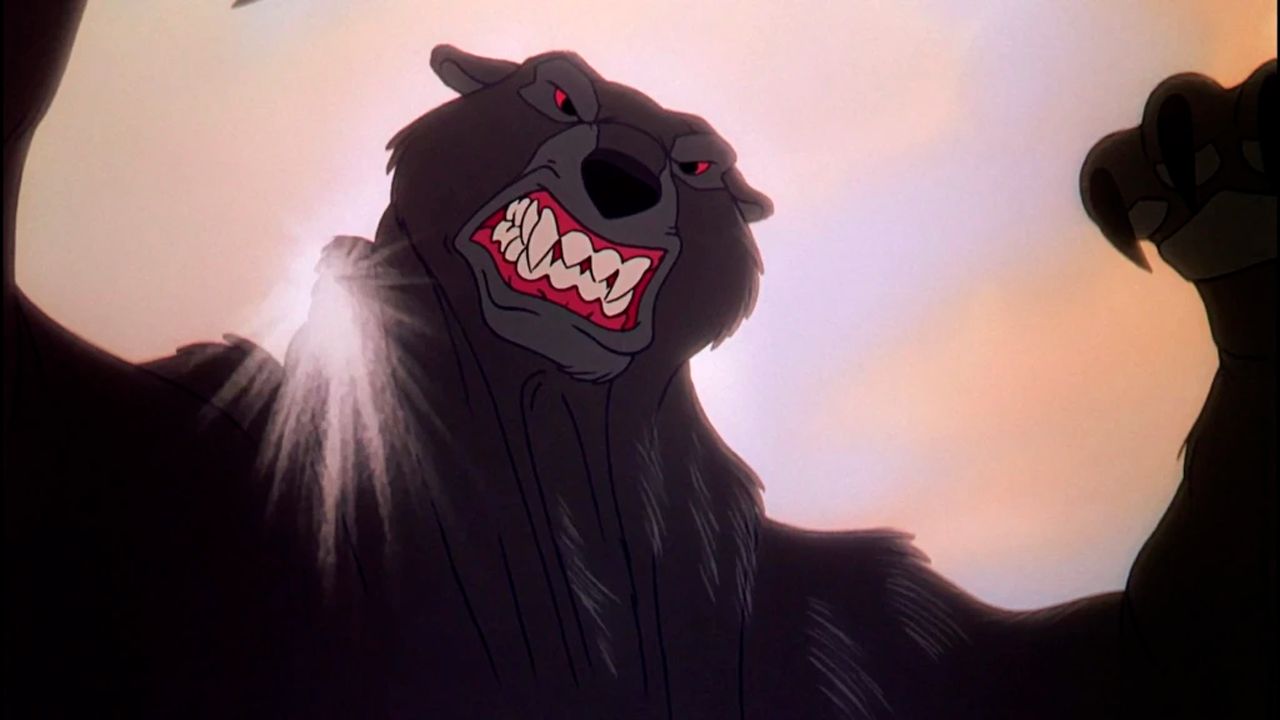 La secuencia puede ser bastante impactante para muchas personas ya que vemos las aterradoras fauces del animal abrirse una y otra vez para eliminar a sus rivales quienes resultan ser Toby, en defensa del viejo Amos Slade y más tarde Tod, quien espera rescatar a su amigo de la infancia. La pelea es bastante fuerte considerando que un público joven están atento a la acción pues el oso negro no tiene reparos en golpear y lanzar por los aires a ninguno de sus oponentes provocando sonidos de dolor en nuestros adorables personajes. Los zarpazos, mordidas y gruñidos están a la orden del momento que se vuelve aún más tenso en comunión con la música de Budy Baker.