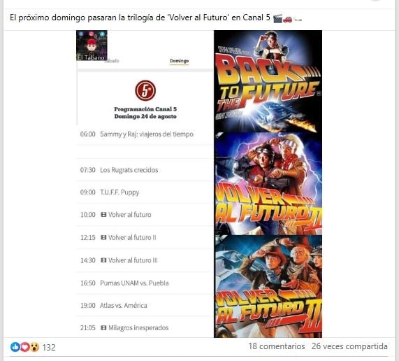 Sin embargo, ¡esta información es completamente falsa!, pues el canal 5 no tiene planeado ningún maratón de Volver al Futuro, con miles de reacciones y compartidos en redes sociales de un supuesto screenshot (que no sabemos de dónde tuvo su origen) de la programación del canal, el listado de las tres películas de Volver al Futuro ha hecho creer a los usuarios y fans que esto es real.