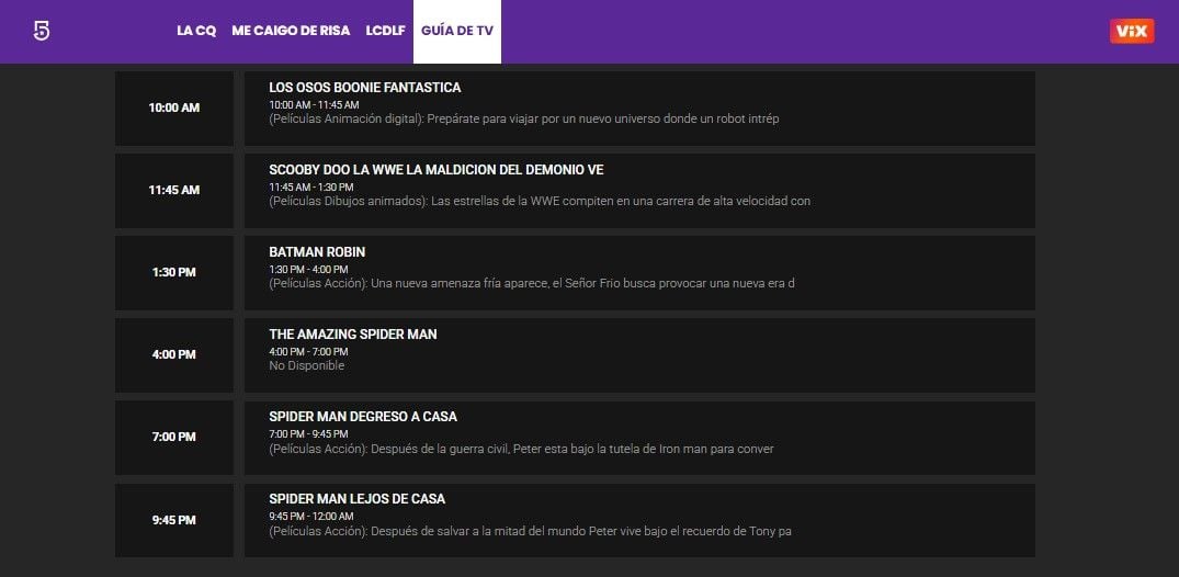 El Canal 5 transmitirá El sorprendente Hombre Araña (2012), protagonizada por Andrew Garfield y Spider-Man: de regreso a casa (2017) y Spider-Man: lejos de casa (2019), estas dos protagonizadas por Tom Holland el día domingo 24 de agosto, con un maratón que comenzará a las 4 pm y finalizará a las 12 am, es decir ocho horas gratis de Spiderman.
