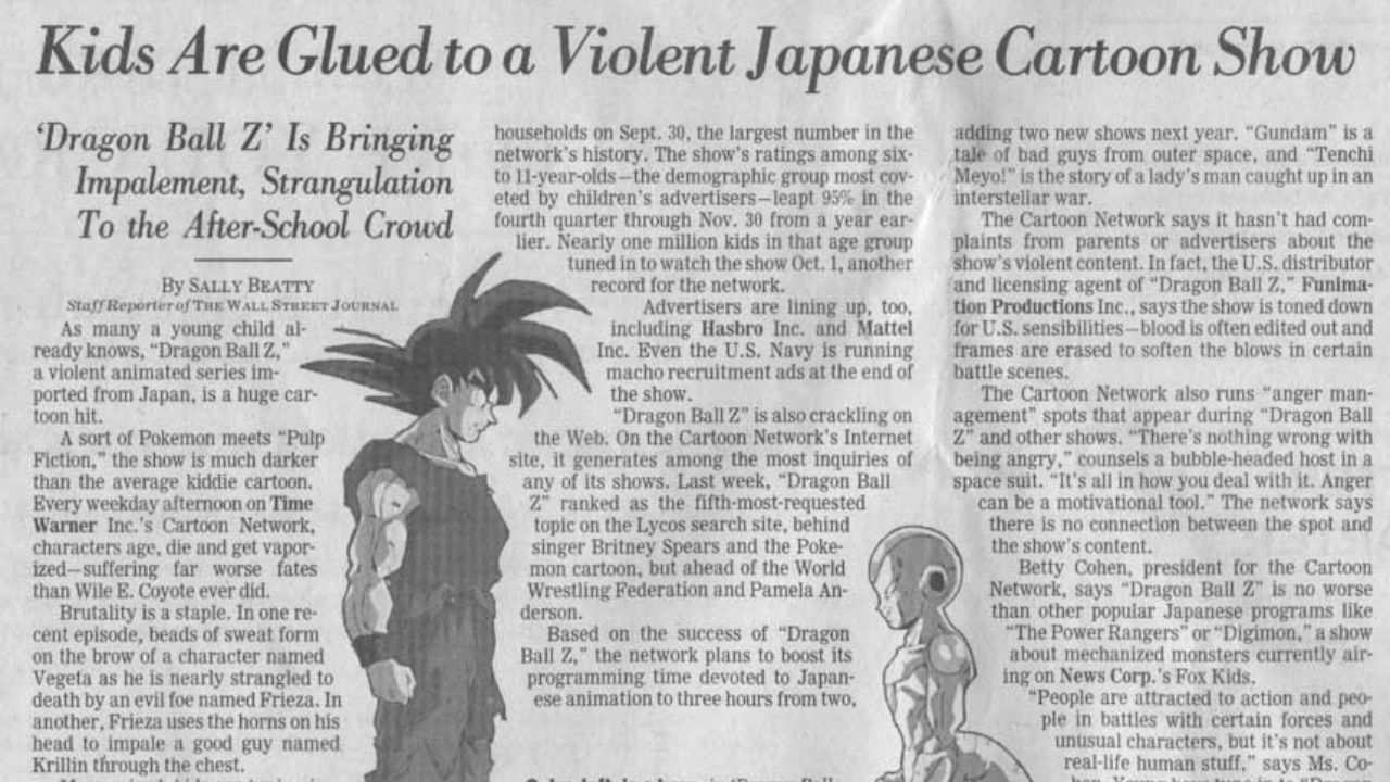 "Basado en el éxito de Dragon Ball Z, la cadena planea aumentar el tiempo de programación dedicado a la animación japonesa de dos a tres horas, añadiendo dos nuevos programas el próximo año. Cartoon Network afirma que no ha recibido quejas de padres ni de anunciantes sobre el contenido violento del programa, y de hecho el distribuidor y agente de licencias de Dragon Ball Z en Estados Unidos asegura que la serie ha sido suavizada para adaptarse a la sensibilidad del público estadounidense. A menudo se elimina la sangre y se borran cuadros para suavizar los golpes en ciertas escenas de batalla", escribió Beatty en su artículo que actualmente puede consultarse en el sitio web del Wall Street Journal.