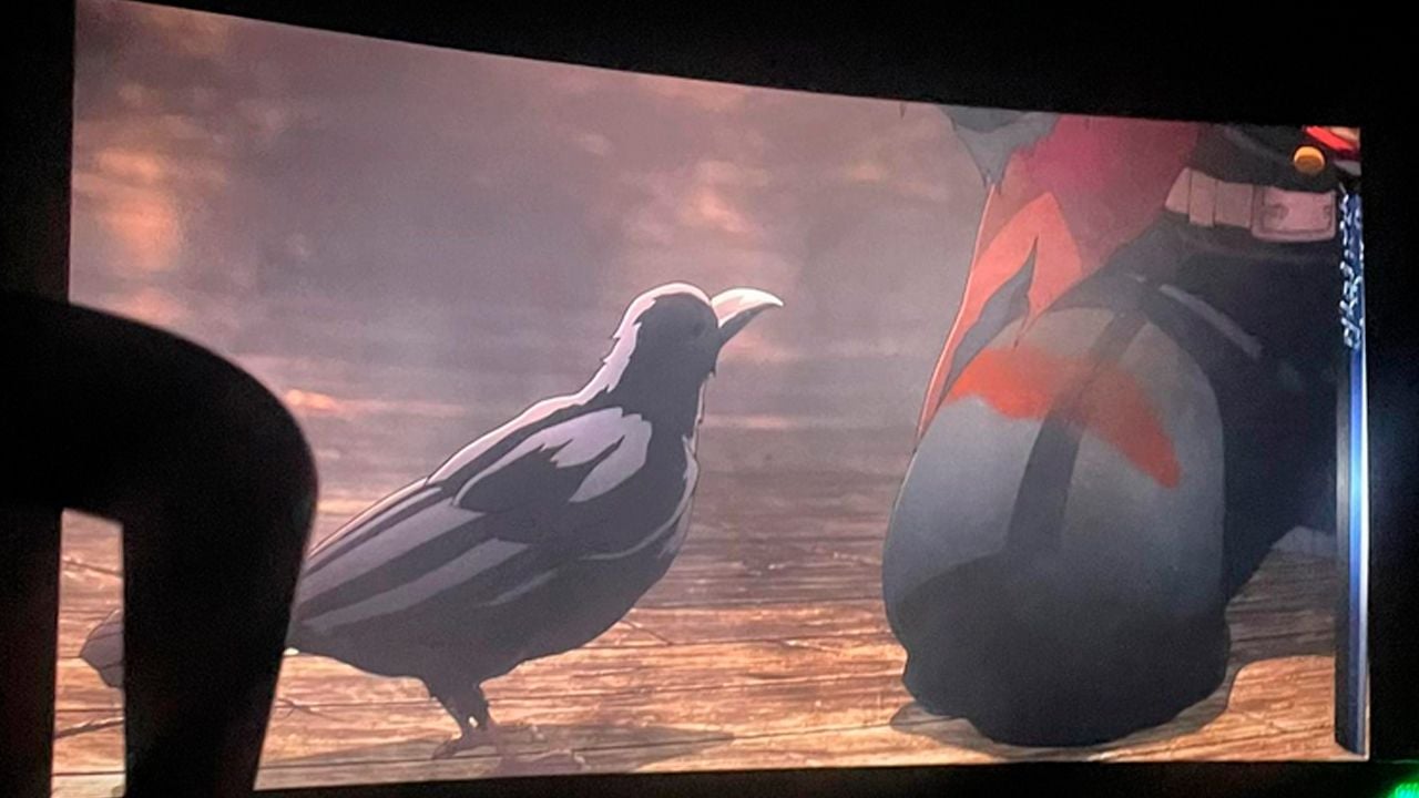 Luego de un momento de silencio absoluto un grito, o más bien graznido de cuervo que los cinéfilos confundieron con un grito, suena desde el lado izquierdo de la sala. Hasta que comienzan a hablar anunciando que los Cazadores de Demonios derrotaron a Akaza, la mayoría de los asistentes piensa que se trata de una persona gritando en la sala del cine.