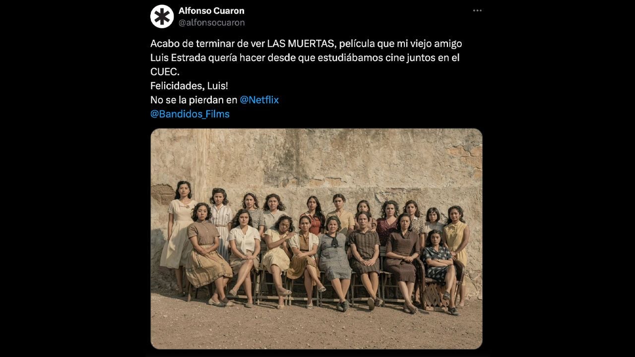 La serie en cuestión es Las Muertas, disponible en Netflix, y Cuarón no dudó en llamarla una verdadera "joya". “Acabo de terminar de ver 'Las Muertas', película que mi viejo amigo Luis Estrada quería hacer desde que estudiábamos cine juntos en el CUEC. Felicidades, Luis. No se la pierdan", escribió el cineasta en su cuenta de X, alborotando a todos sus seguidores.