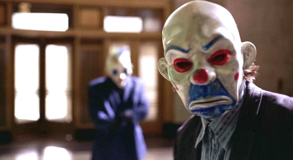 El director inicia la película con un atraco planeado meticulosamente con el objetivo de robar un banco de la ciudad de Gotham en donde todos los ladrones llevan máscaras de payaso. No sabemos quiénes son o que identidad tienen, pero con unos minutos podemos saber que son crueles, de sangre fría y ambiciosos.