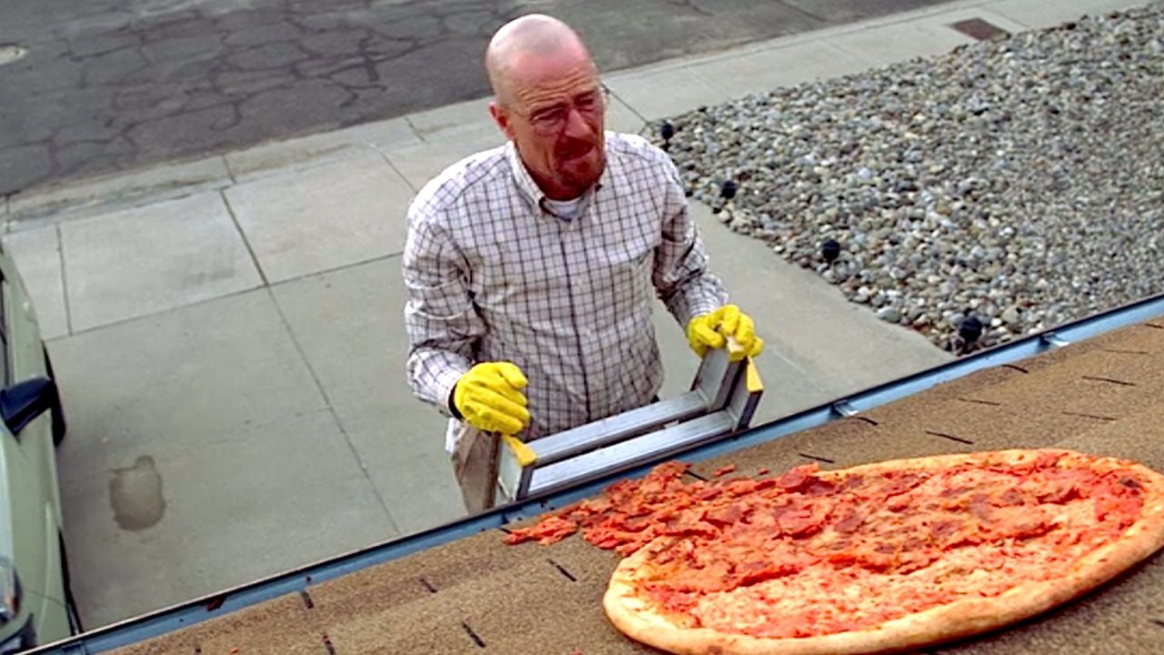 La escena ocurre en la tercera temporada, cuando Skyler (Anna Gunn) ha decidido alejarse de Walter y rechaza sus intentos de reconciliación. Frustrado, Walter llega a casa con una pizza enorme como gesto desesperado para recomponer la relación. Al ver que sus esfuerzos son en vano, sale furioso y, en un impulso, lanza la pizza al aire.