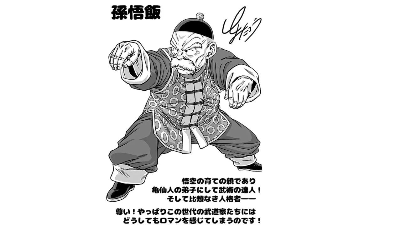 Aunque su aparición en la trama fue breve debido a su muerte a manos de un Goku transformado en simio gigante, el abuelo de Goku se mantuvo como uno de los vínculos más emocionales del protagonista, por lo que en el dibujo se le ve sonriente y con la calidez que siempre caracterizó a su personaje.