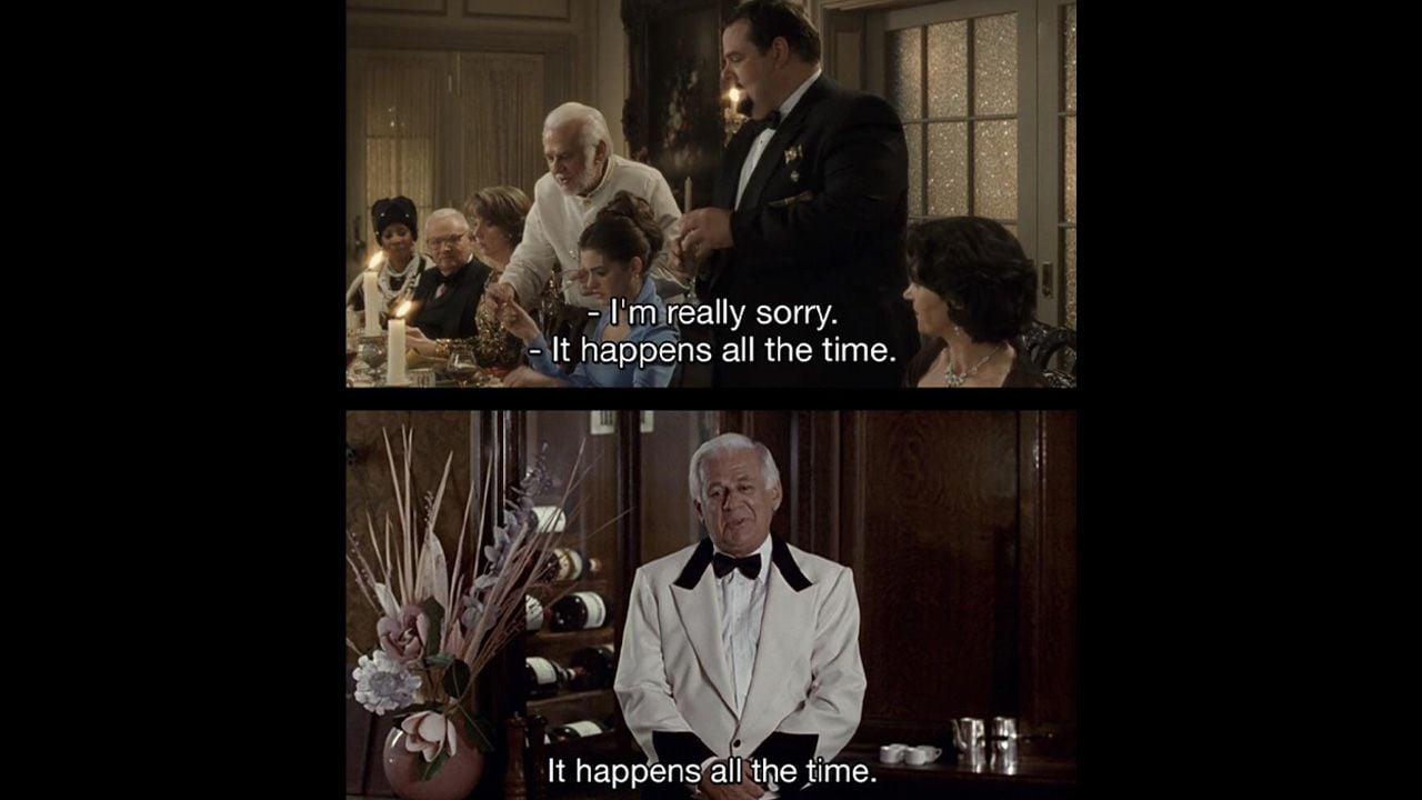 Y justo cuando crees que no puede ir peor, ocurre el guiño maestro: el mismo actor, Allan Kent, reaparece como camarero y, tras el caos, repite con serenidad la misma línea que dijo en Mujer bonita: "Sucede todo el tiempo".