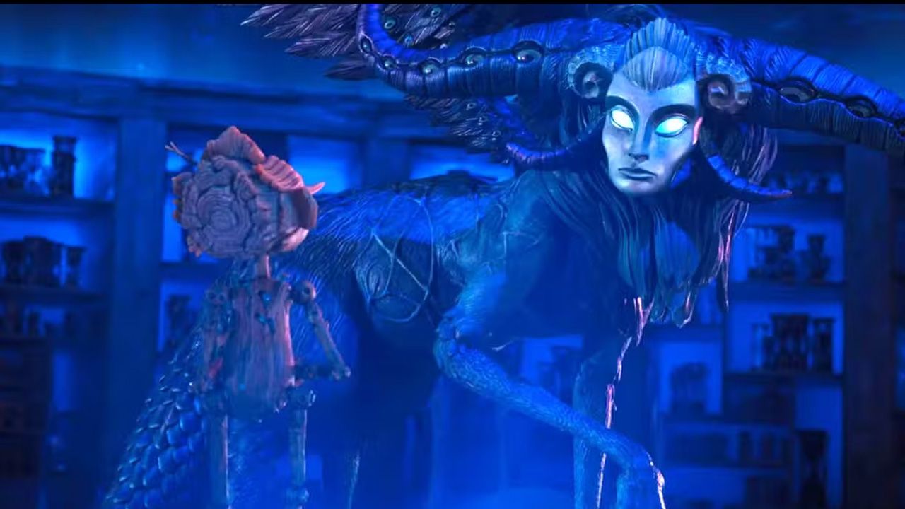 La animación en Pinocho es un espectáculo en sí misma. Hecha con stop-motion, cada movimiento, cada gesto, fue creado cuadro a cuadro, con una precisión casi mágica. Y esa paciencia se siente en pantalla. Todo parece vivo: las texturas de la madera, la luz que se filtra en las iglesias, los rostros marcados por el dolor.