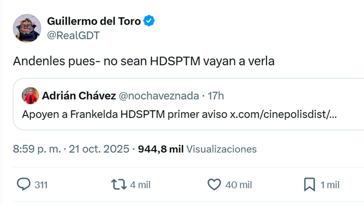 Durante la noche del martes, el cineasta mexicano retomó una publicación en X de @nochaveznada para invitar al público a apoyar el largometraje dirigido por Arturo y Roy Ambriz, que se integra a salas de cine nacionales a partir de este jueves. Aunque fue Adrián Chávez quien mencionó “Apoyen a Frankelda HDSPTM”, del Toro replicó sus palabras para continuar la invitación a los espectadores.