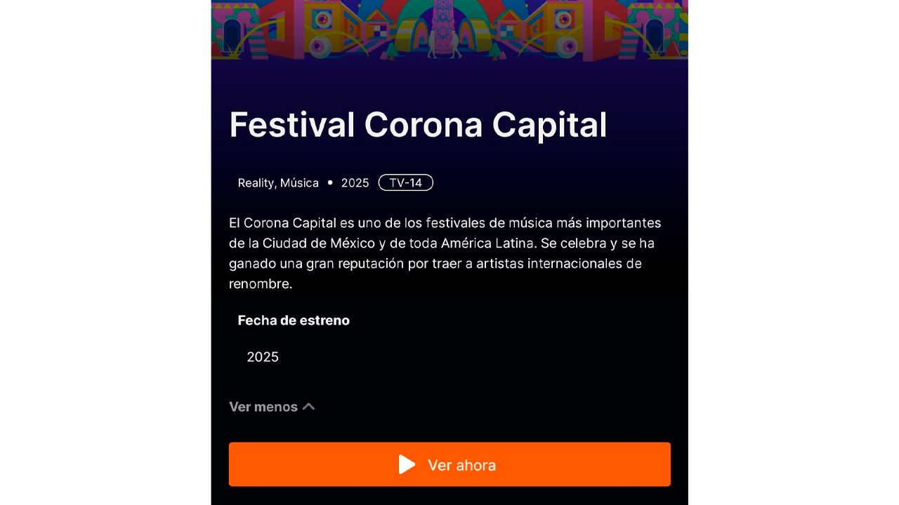La transmisión estará tanto de manera gratuita en la plataforma, así como en el plan con suscripción premium. El evento ya aparece disponible en su catálogo bajo el título Festival Corona Capital y si das clic en el botón “Ver ahora”, se reproduce un avance en el que se especifican todas las fechas en que transmitirán el evento musical.