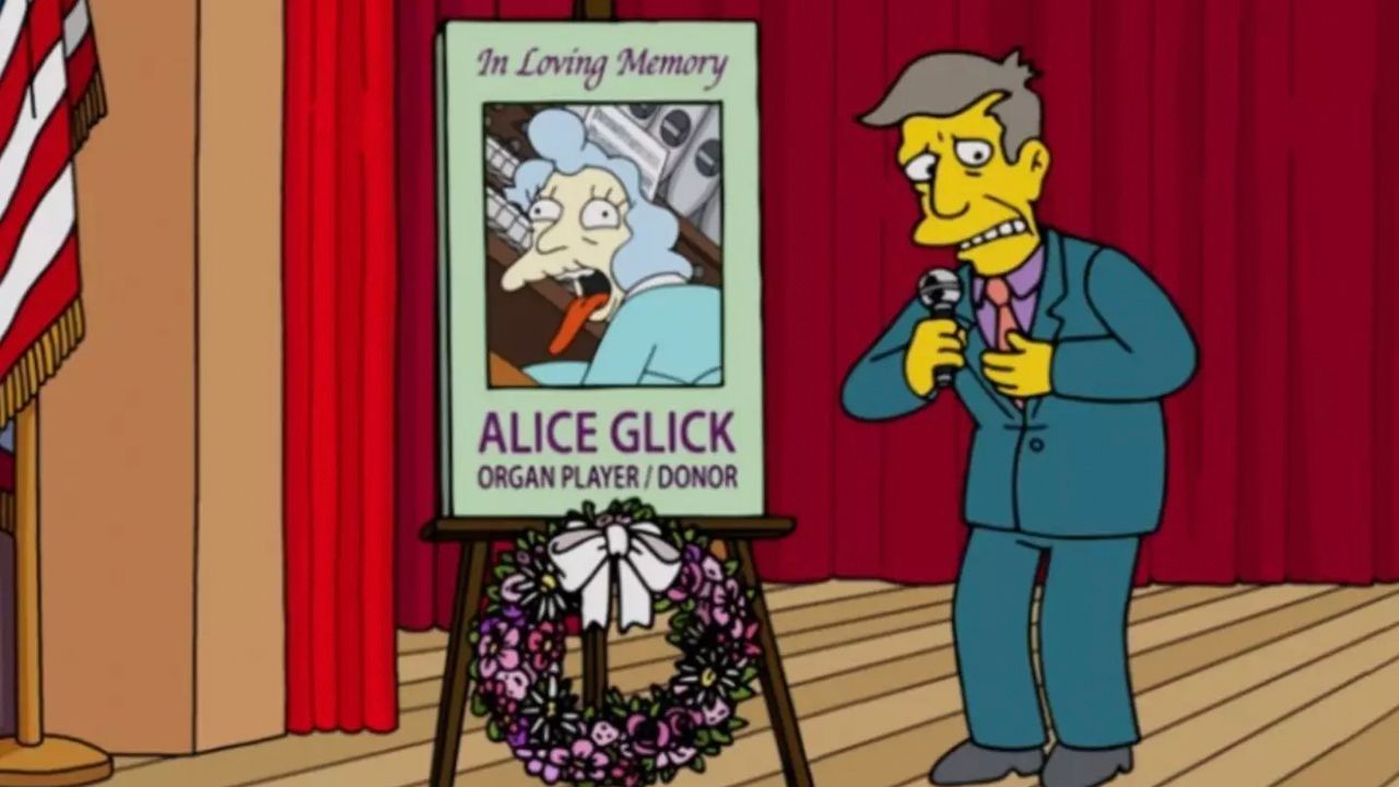 ¿Recuerdas a Alice Glick, la organista de la iglesia de Springfield? Bueno, este simpático personaje que desde su debut en 1991 se convirtió en todo un clásico de la serie animada de Matt Groening, ha muerto.
