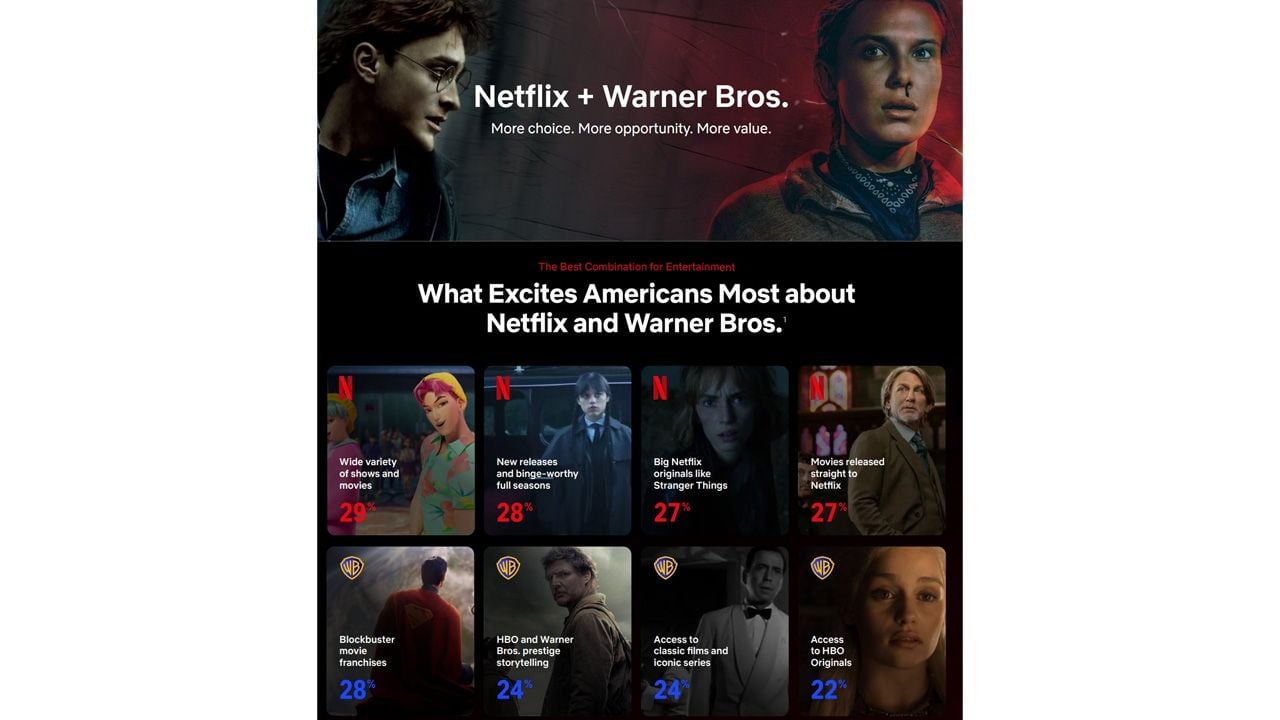 Mientras tanto, Sarandos continúa asegurando que las películas del estudio no perderán su lanzamiento en salas de cine, sino que la unión entre ambas compañías enriquecerá la experiencia de los espectadores. En un reciente banner que debutaron hoy, la empresa de streaming señala que Netflix y Warner Bros. darán más oportunidades y valor al catálogo en el que podrán navegar los suscriptores.