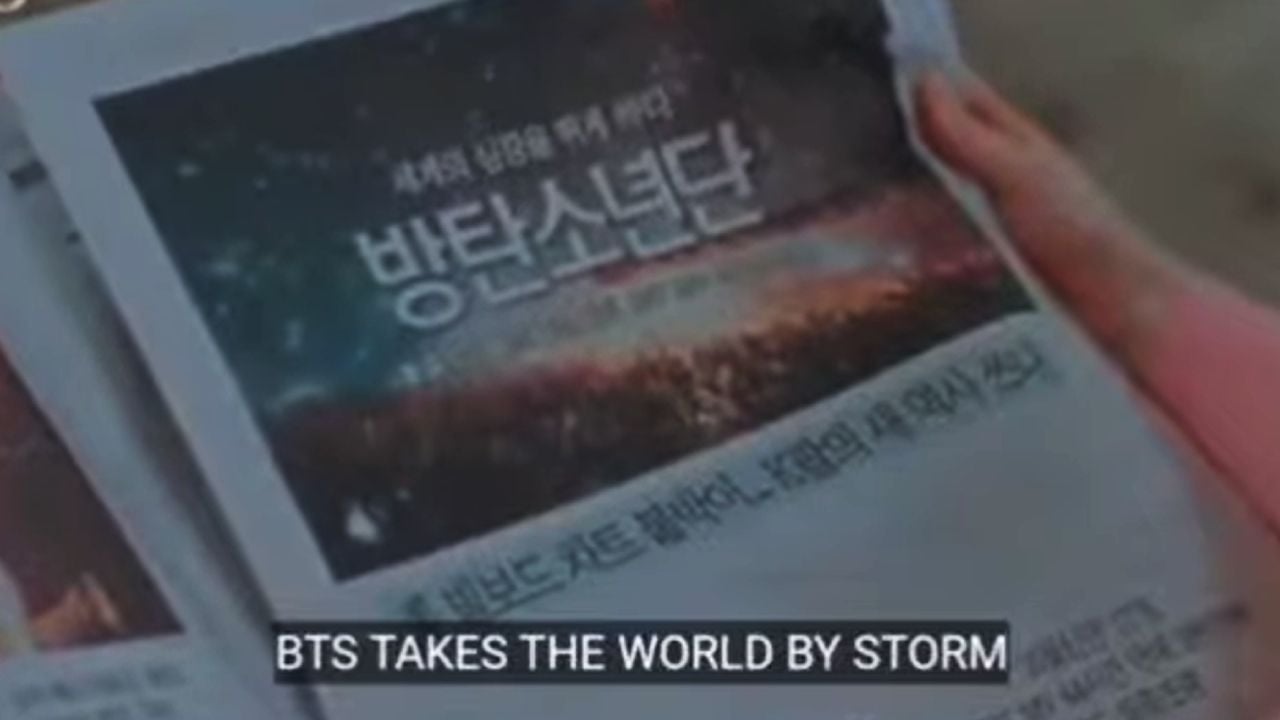 Otro ejemplo lo tenemos en El rey: eterno monarca, donde BTS aparece en la nota principal de un periódico que dice "BTS se apodera del mundo".