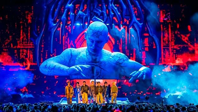 La experiencia arranca con los ocho integrantes vistiendo trajes blancos, marcando desde el primer minuto la magnitud del espectáculo y el tono épico del tour: