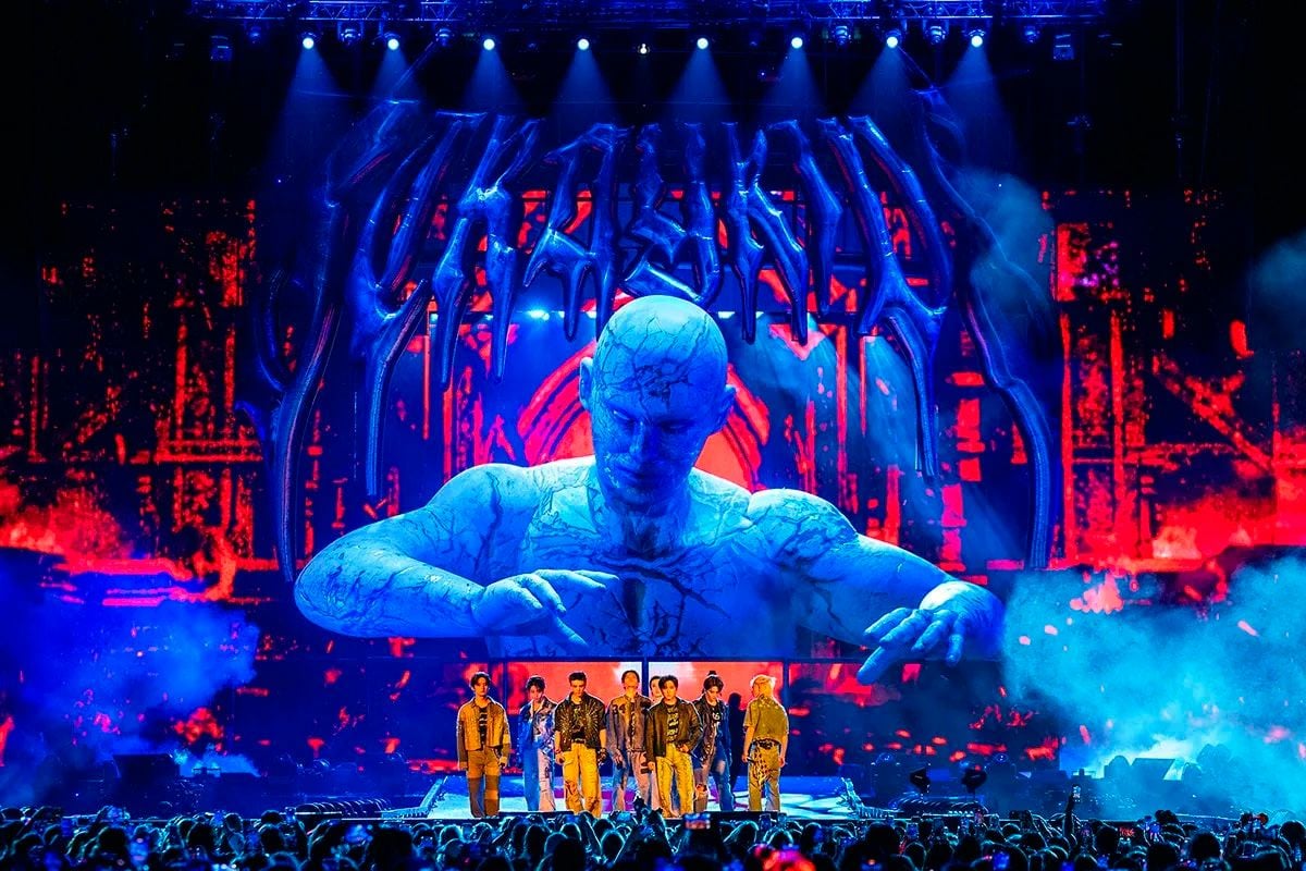 El uso del “Titan” que parece sacado de Attack on Titan. Una enorme figura inflable que domina el escenario en varias fechas incluida México, no es un simple truco visual. En IMAX, su presencia genera una sensación de escala y majestuosidad que refuerza el concepto de dominATE.