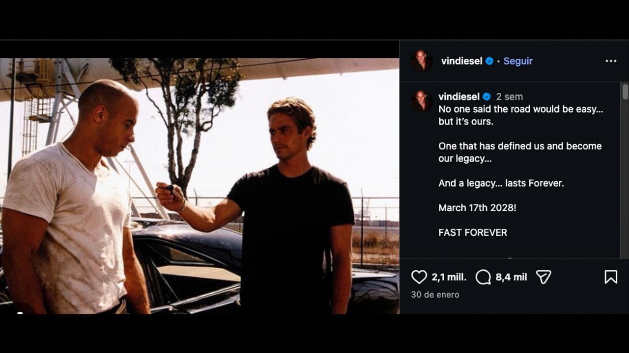 El anuncio no llegó con un simple comunicado frío. Diesel lo hizo a su manera: a través de Instagram. El actor publicó una imagen suya junto a Paul Walker, una fotografía cargada de nostalgia para los fans de la franquicia. Y con ella reveló también el título de la película: Rápidos y Furiosos: Para Siempre.