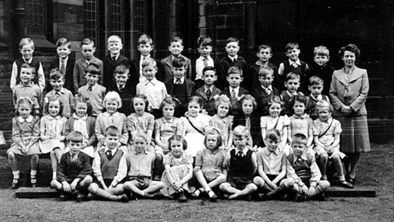 Otra fotografía lo ubica en la Methodist Primary School de Wigan. Está en la fila trasera, quinto lugar desde la izquierda, rodeado de compañeros con peinados impecables y uniformes similares, parece uno más del grupo. Resulta curioso pensar que entre esos niños estaba quien años después interpretaría a uno de los magos más icónicos del cine.