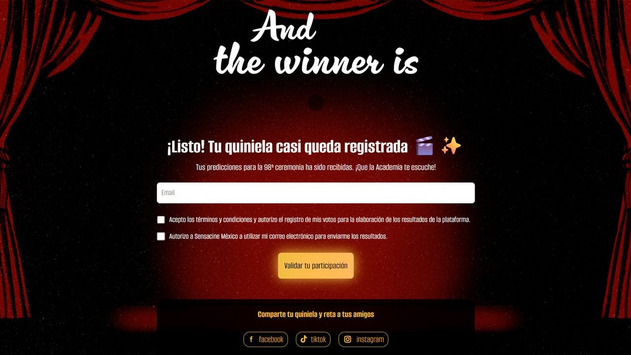 And the winner is… ya se encuentra activa en este enlace y así lo estará hasta que se lleve a cabo la entrega de premios, por lo que en este mismo instante puedes responderla en camino a los Oscar 2026, cuya ceremonia se realizará el próximo domingo 15 de marzo. Y si deseas comparar tus conocimientos con los de tus amigos, no olvides compartir tu quiniela a través de redes sociales como Facebook, TikTok e Instagram. ¡No te pierdas toda la cobertura en Sensacine México!
