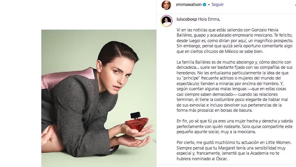 A pesar de que Watson no es activa en su cuenta personal de Instagram, esto no detuvo que miles de usuarios comentaran en su última publicación de diciembre de 2025, donde los mexicanos han llegado a bombardear de comentarios, entre ellos se encuentra una carta pública en la que un usuario (@luiscobosp), advierte a Watson sobre la reputación del empresario, su familia y sus relaciones pasadas: