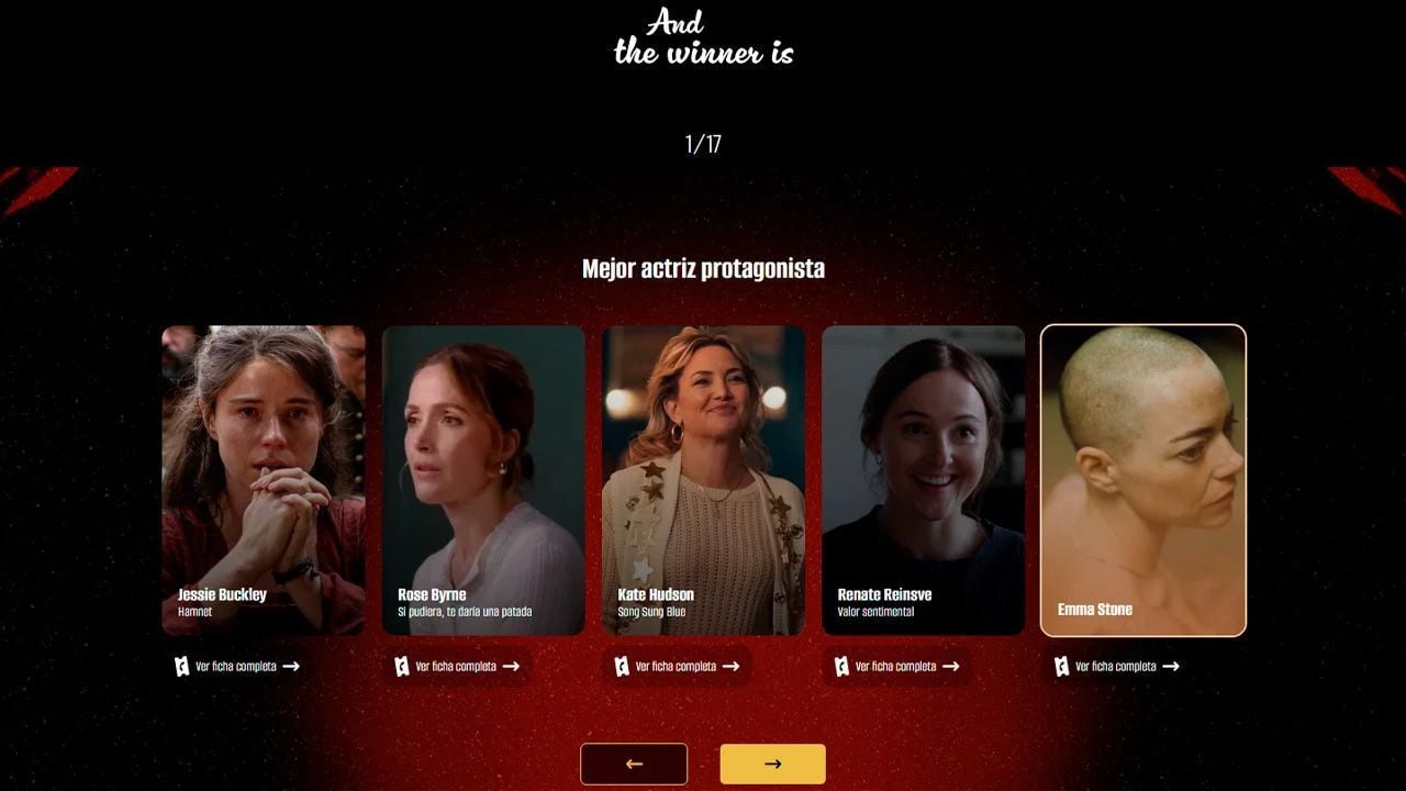 Nuestra quiniela lleva por nombre And the winner is… donde podrás seleccionar a tus 17 ganadores de una manera muy sencilla. Lo único que tienes que hacer es abrir este enlace y escoger a tu favorito por categoría. Una vez que hagas clic en tu elegido, la foto del nominado se pintará de amarillo y podrás avanzar a la siguiente sección dándole clic a la flecha apuntando hacia la derecha.