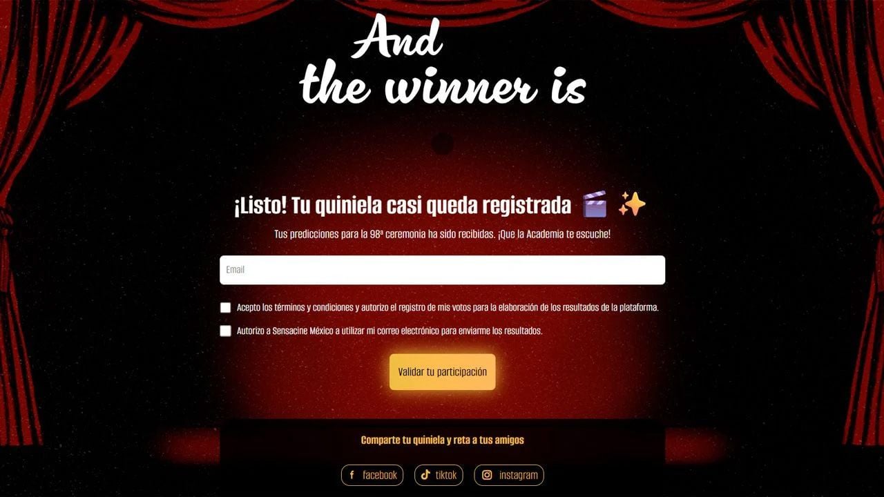 ¿Te arrepentiste de último momento y cambiaste de decisión? No importa, tienes la posibilidad de regresar a la categoría anterior dando clic a la flecha hacia la izquierda y elegir a un nominado distinto como ganador. La quiniela ya se encuentra activa y así lo estará hasta mañana, pero es importante registrar tu correo electrónico una vez que termines para validar tu participación.
