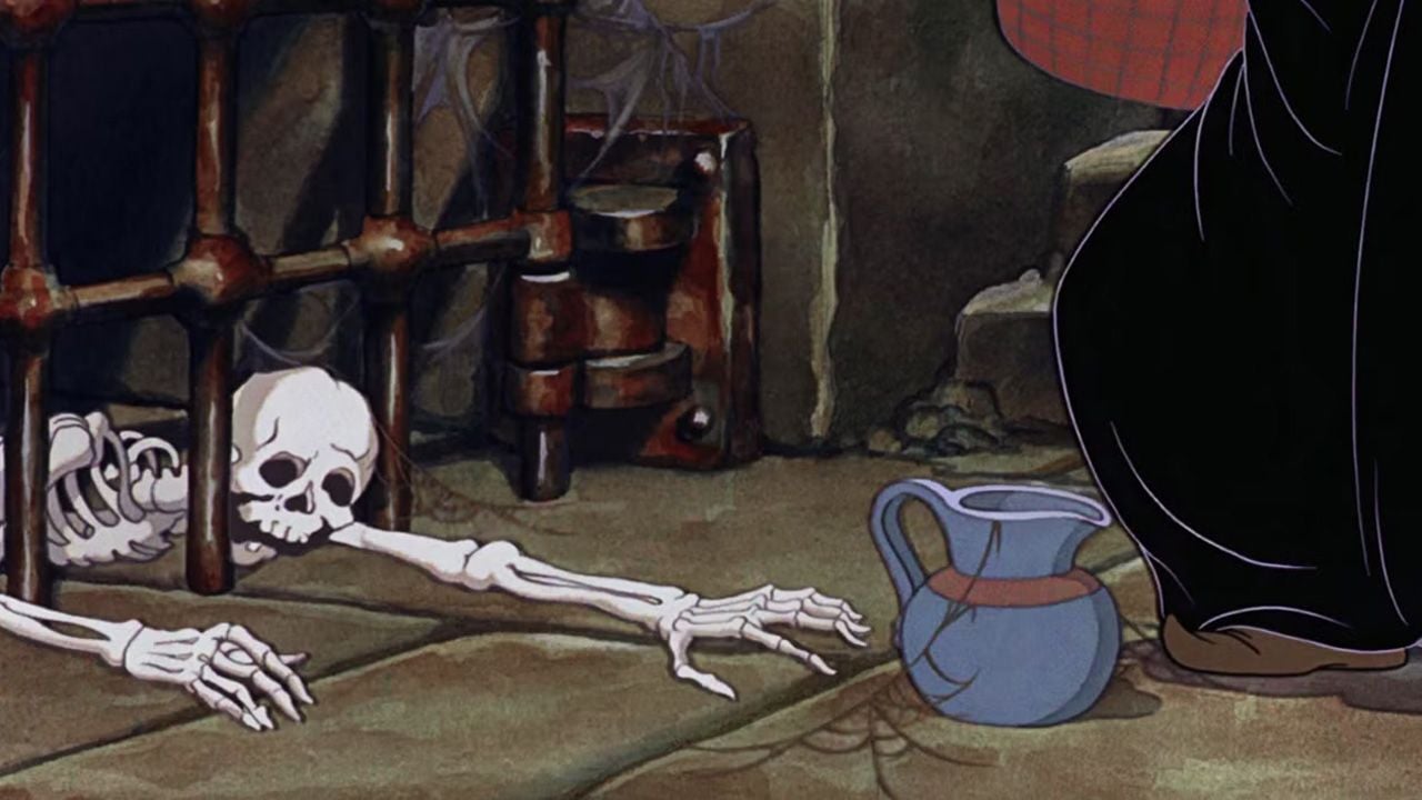El castillo también guarda algo más que espejos mágicos y escaleras para hacer un drama. En una de las escenas más inquietantes, la Reina baja a su calabozo, atraviesa pasillos oscuros y se encuentra rodeada de cadenas, huesos y restos de personas que claramente no tuvieron un final muy amable. Es ahí donde aparece una imagen que muchos espectadores dejaron pasar durante años: un esqueleto encerrado en una celda, con la mano extendida hacia una jarra de agua que nunca alcanzó.