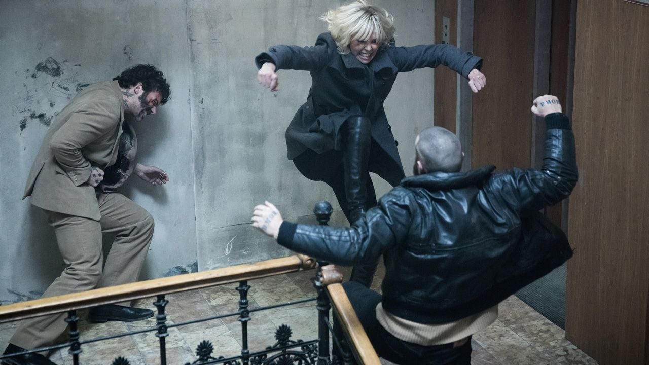 Si Atómica tiene una secuencia que justifica por sí sola la recomendación, es la pelea de la escalera. La escena parece construida como un plano secuencia largo, donde Lorraine enfrenta a varios enemigos en un edificio mientras intenta proteger a un hombre clave para la misión. No es una coreografía bonita: es sucia, desesperada y agotadora.