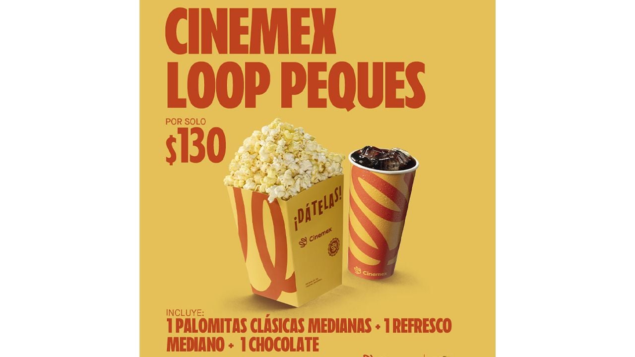 Como parte de los beneficios de Cinemex Loop, la cadena ha puesto a la venta su nuevo combo Cinemex Loop Peques, uno que incluye unas palomitas clásicas medianas, un refresco mediano y un chocolate de Conejito Turín; todo eso por 130 pesos mexicanos. Si deseas cambiar el sabor de tus palomitas, podrás hacerlo por 15 pesos adicionales o tomar Fuze Tea en lugar de regreso por 5 pesos más.