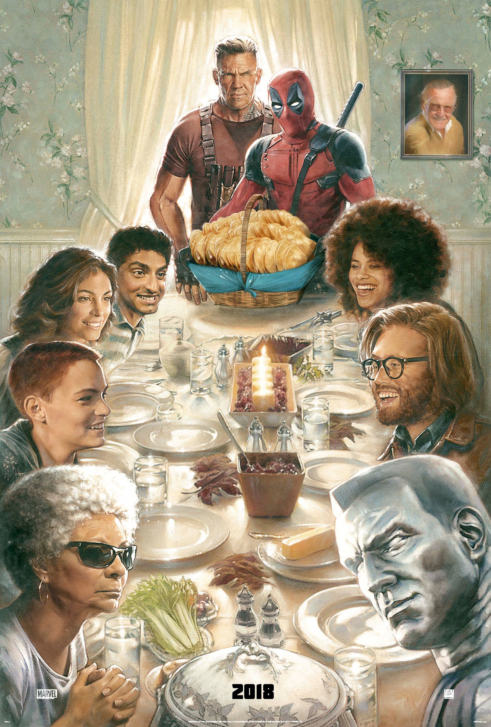 En torno a la mesa están los miembros del elenco (Karan Soni, Morena Baccarin, Brianna Hildebrand, Leslie Uggams, Stefan Kapicic, T.J. Miller, Zazie Beetz y en el cuadro, Stan The Man Lee) reunidos en torno a lo que puede ser la cena de Nochebuena, la comida de Navidad, o por qué no, la celebración de fin de año. Todos fueron retratados en sus personajes y la mesa está encabezada por Ryan Reynolds (Deadpool) y Josh Brolin (Cable).