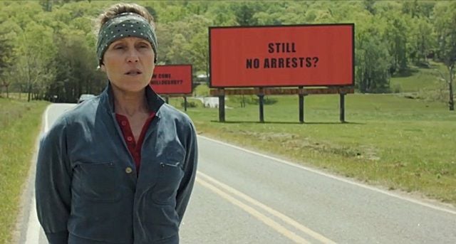 Tres anuncios por un crimen (2017), dirigida por Martin McDonagh, es la aclamada película dramática y de humor negro que relata la historia de Mildred (Frances McDormand), una madre de familia que en un acto desesperado por ejercer presión para la resolución del caso de asesinato de su hija adolescente, coloca mensajes en los tres espectaculares a las afueras de su pueblo: Ebbing. Uno de ellos alude directamente a la eficiencia del querido jefe policial William Willoughby (Woody Harrelson), lo que provoca que se inicie una serie de tensiones entre la mujer y las autoridades del pueblo.