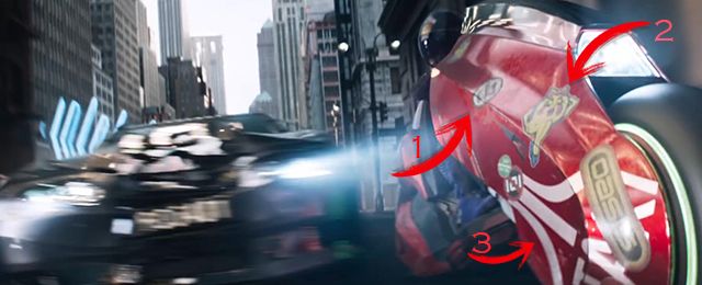 Además de la referencia hacia la moto que conducía Shotaro Kaneda en la cinta Akira, hay varias estampas pegadas al vehículo, como el logotipo de la serie El gran héroe americano (flecha 1), la mismísima Ms. Pac-Man que tenía su propio videojuego para Atari, la famosa consola casera cuya imagen aparece en la tercera flecha.
