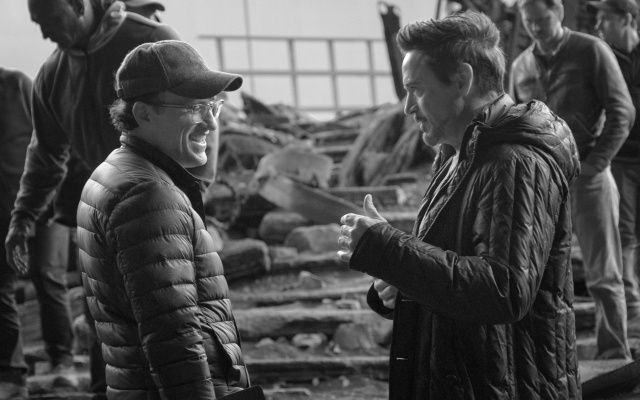 Anthony Russo y Robert Downey Jr. platican muy animados, aparentemente antes de dar inicio a una escena en la que podemos apreciar la devastación que Thanos va a dejar en algún momento, lo que deducimos por los escombros que podemos ver al fondo. También es posible que la foto haya sido tomada al final del día de filmación y que actor y director estén comentando lo bien que salió todo ese día... o quizá simplemente Downey Jr. le esté contando un chiste.