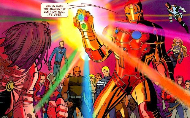 Aunque fue hecho a la medida para Thanos, Mr. Fantastic fue el primer mortal en ponérselo y Tony Stark el primer humano en utilizarlo. En los comics, The Hood trata de reunir las Gemas del infinito y los Avengers se reúnen para impedirlo. Stark se lleva el guantelete supuestamente para desaparecerlo, pero lo que hace en realidad es quitarle las gemas y dividirlas entre los Illuminati para salvaguardarlas.