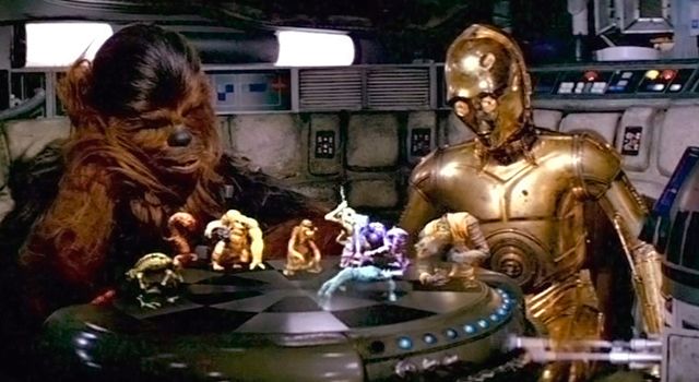 Desde El despertar de la fuerza no veíamos el tablero de Dejarik hacer su aparición, el juego similar al ajedrez que está dentro del Halcón Milenario y que fue introducido en Una nueva esperanza. En Han Solo: Una historia de Star Wars, lo podemos ver en una escena en la que Beckett le está tratando de enseñar a Chewbacca cómo se juega, pero el wookie se enoja y quiere tirar las piezas holográficas. Al parecer aprendió bien ya que en el episodio IV lo vemos jugar con R2-D2.