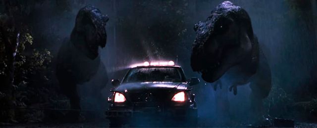 La intención de Eddie Carr (Richard Schiff) era salvar a sus compañeros que estaban a punto de caer de un precipicio muy alto, pero dos Tiranosaurios Rex aparecieron de la oscuridad para destrozar la camioneta donde se encontraba el hombre, para que después uno de los dinosaurios lo tomara y lo levantara mientras el otro lo mordió del otro lado, partiendo a la persona por la mitad. ¿Quién dice que no comparten la comida?