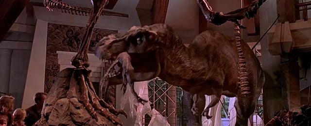 Un Velociraptor amenazaba con atacar al Dr. Alan Grant (Sam Neill) y compañía cuando repentinamente apareció un Tiranosaurio Rex para hacerle frente al veloz y pequeño dinosaurio, tomándolo con su enorme hocico, agitándolo en el aire y terminar azotándolo en el piso para acabar con la vida del reptil. Después llegó un segundo Velociraptor pero tuvo el mismo destino fatal su compañero tras ser lanzado a un esqueleto y a las escaleras. El rey de los dinosaurios salvando el día.